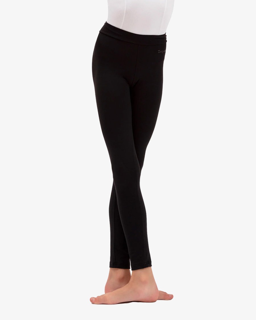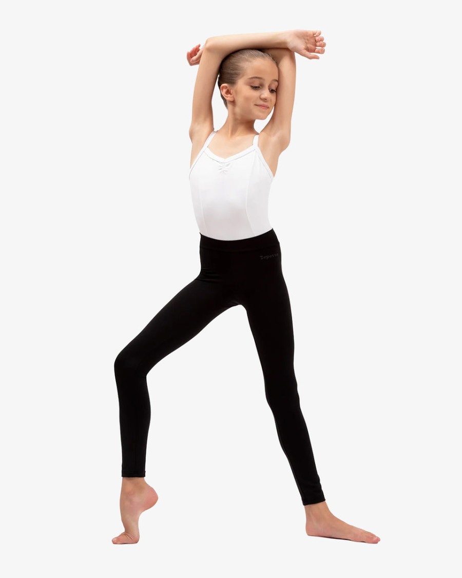 Black leggings with sewn waist band. Crotch gusset for comfort. This model also exists in adult.