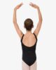 Leotard with thin straps. Round gathered neckline to highlight the top of the body. The fantasy detail in the back enhances its classic style. The cross-over chiffon frill gives a glimpse of the movements.