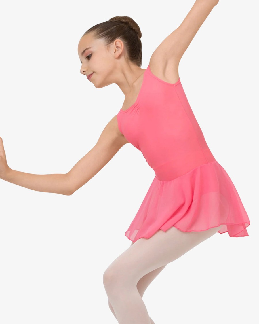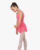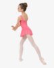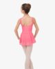 This leotard is specifically developed for the first years of dance practice. The body maintain is perfectly respected thanks to the large straps. The gathered neckline adjustable with a small internal satin ribbon brings a fancy touch to the leotard. The chiffon skirt gives a glimpse of the movements. This style is lined in the front.