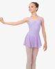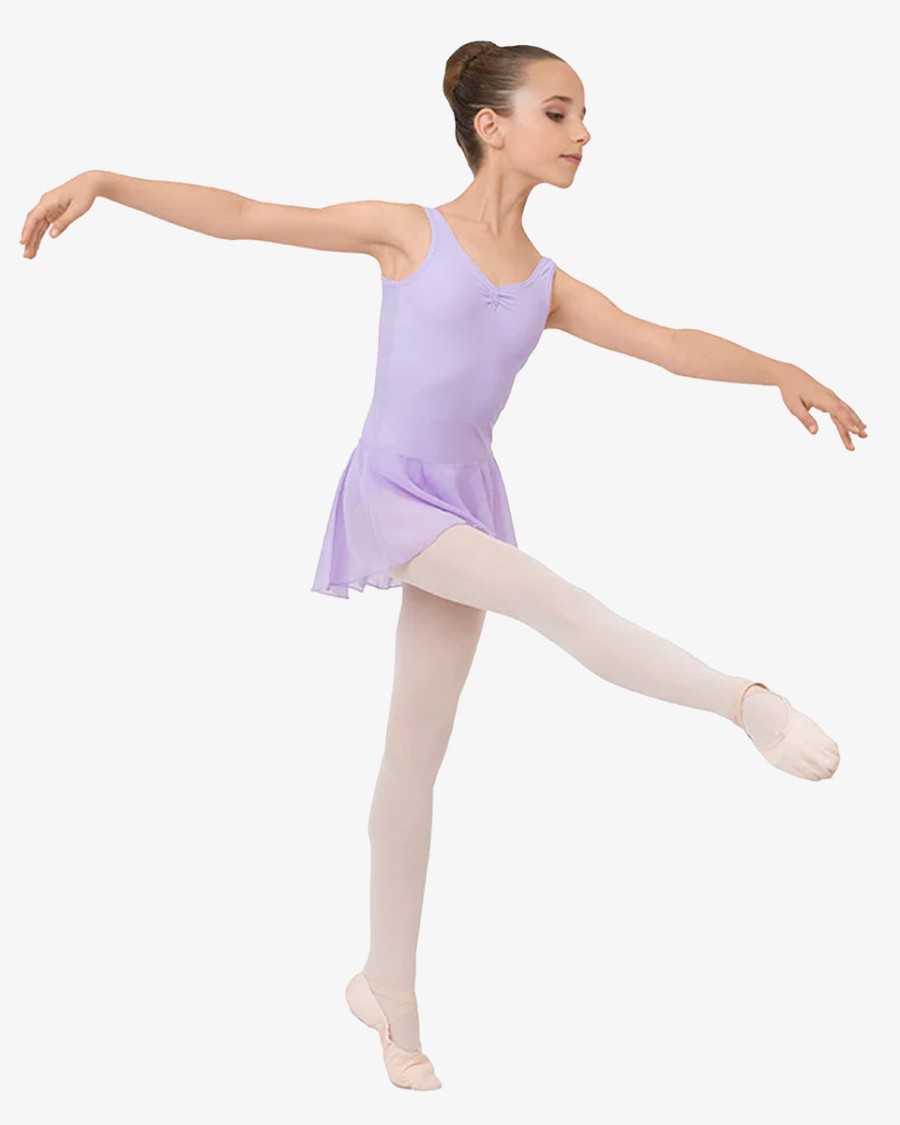 Girl’s leotard, tank shape. Specifically developed for the first years of dance practice. The body maintain is perfectly respected thanks to the large straps. The gathered neckline adjustable with a small internal satin ribbon brings a fancy touch to the leotard. The chiffon skirt gives a glimpse of the movements. This style is lined in the front.