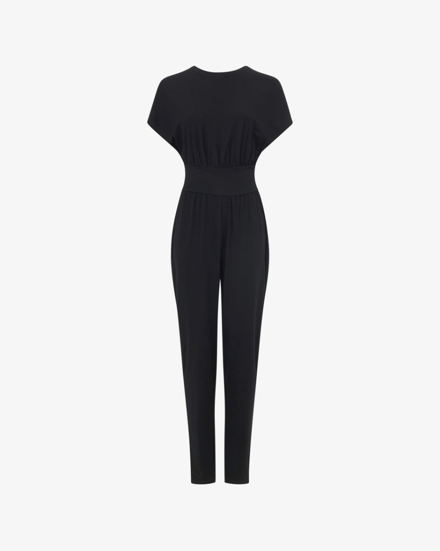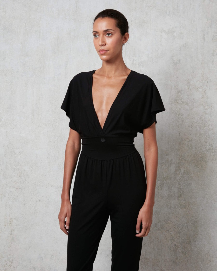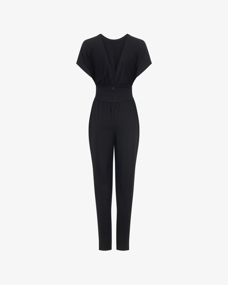 This jumpsuit is a modern interpretation of the classic dance leotard, featuring butterfly armholes, a fitted cut at the legs, and a V-neckline that can be worn at the front or the back. It’s the perfect piece for gentle workout sessions or for an elegant and comfortable everyday look.