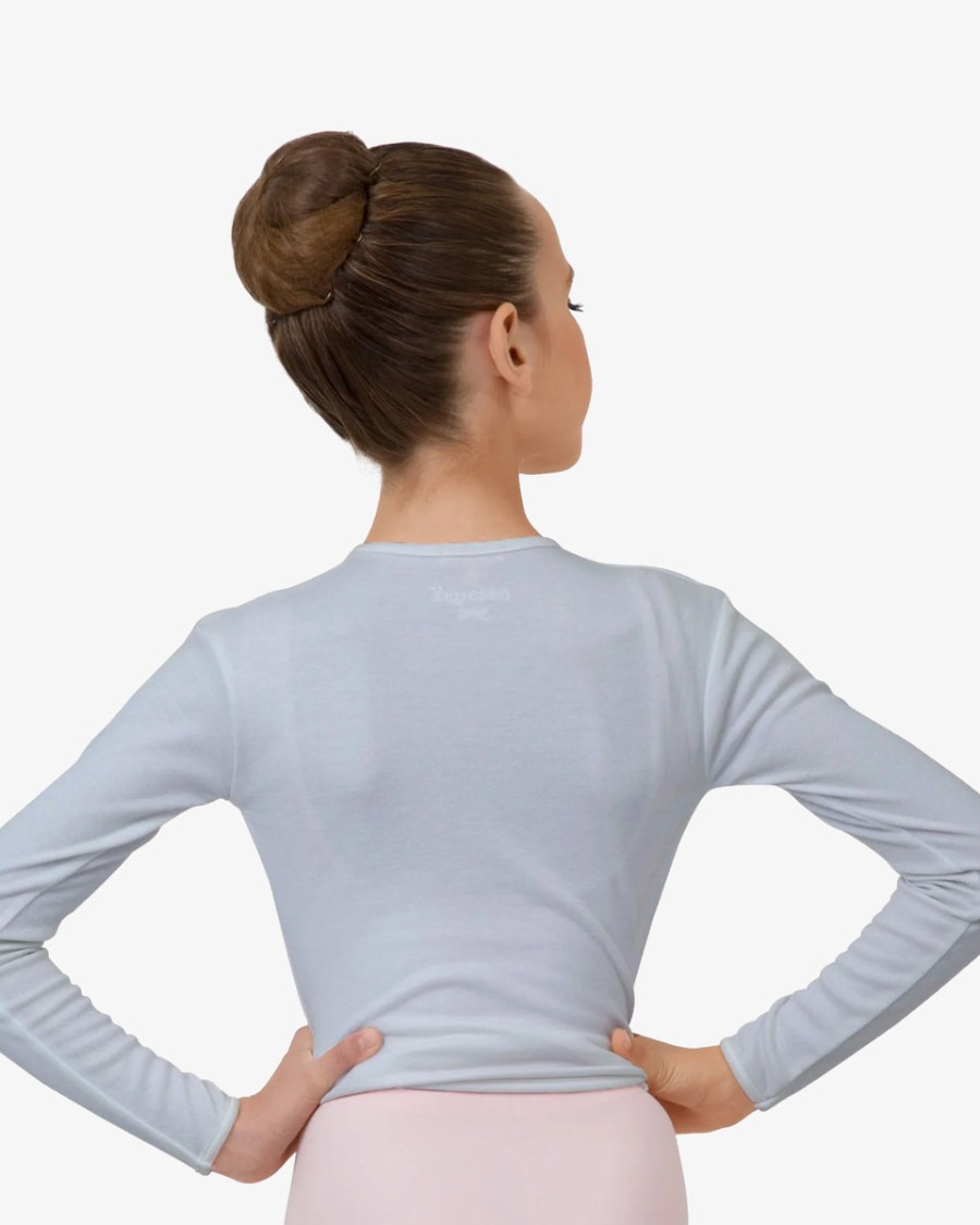 Wrap-over top with long sleeves for young dancer. Ideal for warming-up. Warming-up is an essential step for all dancers, regardless of their level in dance, our warm-up items are comfortable and offer excellent thermal protection. Drawstrings to knot on side, V-neck.