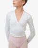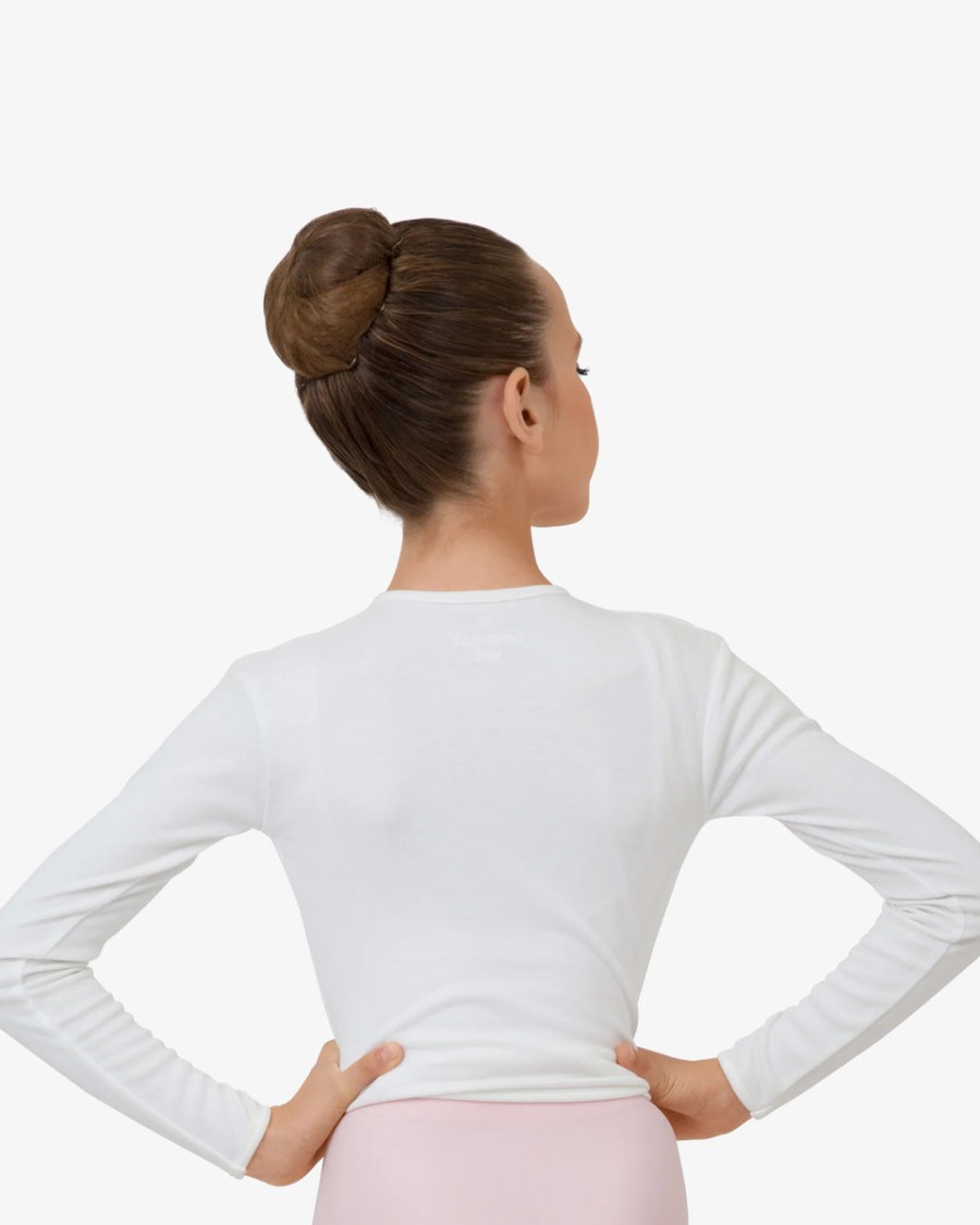White wrap-over top with long sleeves for young dancer. Ideal for warming-up. Warming-up is an essential step for all dancers, regardless of their level in dance, our warm-up items are comfortable and offer excellent thermal protection. Drawstrings to knot on side, V-neck.