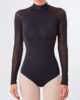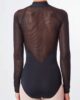 This officer’s fishnet leotard highlights the silhouette with a wide back-and-back neckline completed with long sleeves dressed with a stripe pattern made with a zigzag stitch. The collar can be adjusted with a zipper on the front and brings structure and femininity to the silhouette while highlighting the body and movements of the dancer.