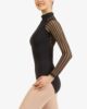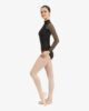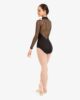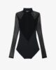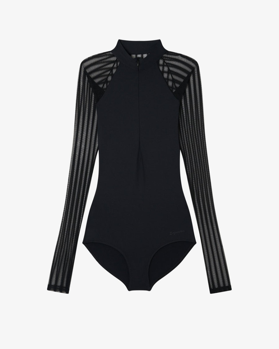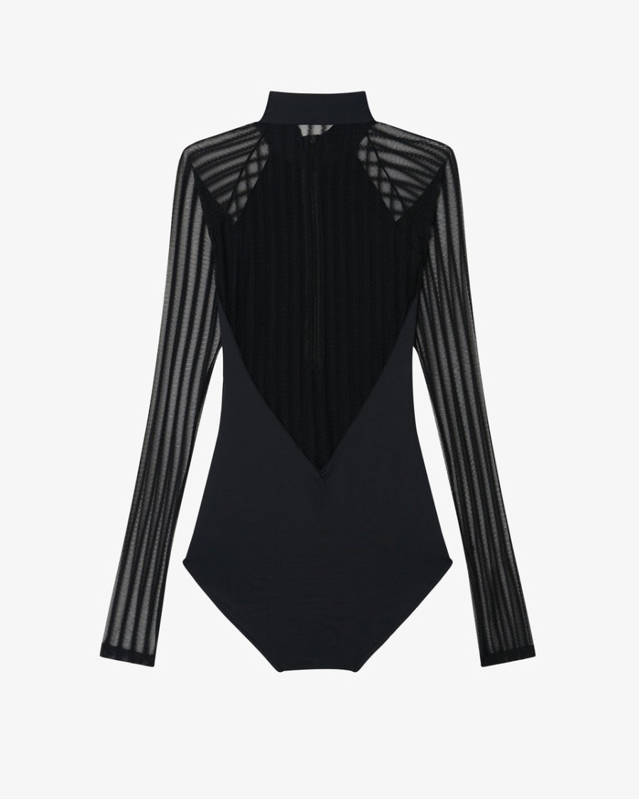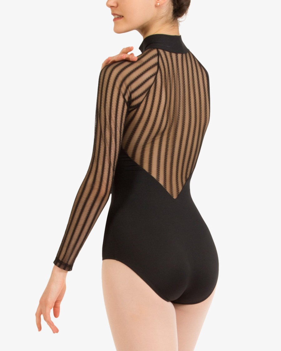 This officer’s fishnet leotard highlights the silhouette with a wide back-and-back neckline completed with long sleeves dressed with a stripe pattern made with a zigzag stitch. The collar can be adjusted with a zipper on the front and brings structure and femininity to the silhouette while highlighting the body and movements of the dancer.