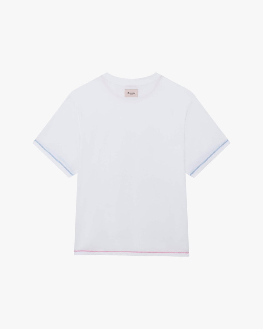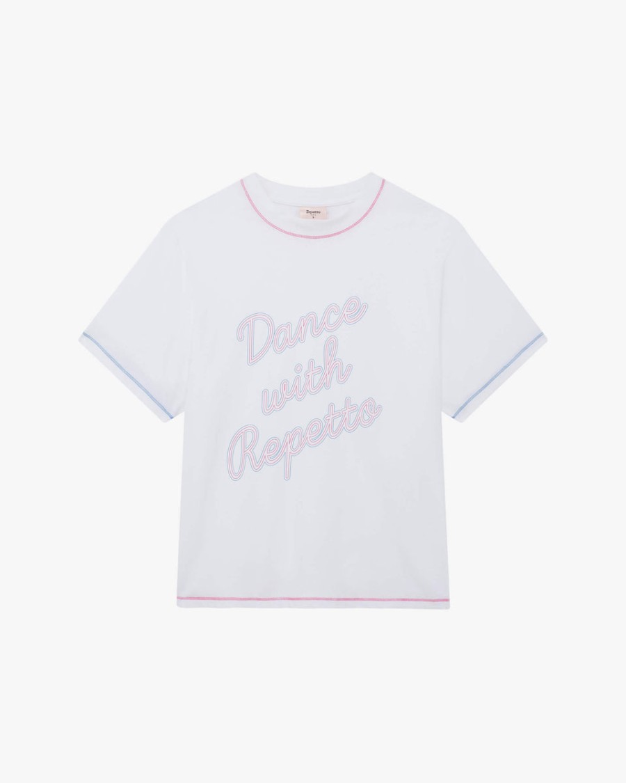 Details: Embrace the vibrant and colorful spirit of the 80s with our Dance with Repetto capsule. A fusion of retro sophistication and elegance to accompany your every move with style. This round-neck t-shirt offers a vintage and casual look with its loose fit, wide short sleeves, and graphic design on the front. – Rounded neck – Short sleeves – Masculine fit
