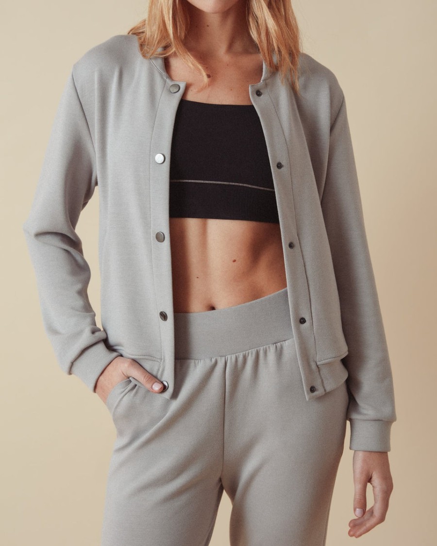 Inspired by vintage style, this teddy jacket offers an elegant yet contemporary look. Snap buttons allow it to be worn open or closed — pair it with matching pants for an urban outfit, or layer it over your activewear for a sporty edge.