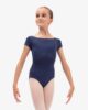 This leotard with short raglan sleeves has an original cut with a square neckline. It can be worn on the shoulders, in order to underlines the upper body and the head bearing. This model also exists in adult.