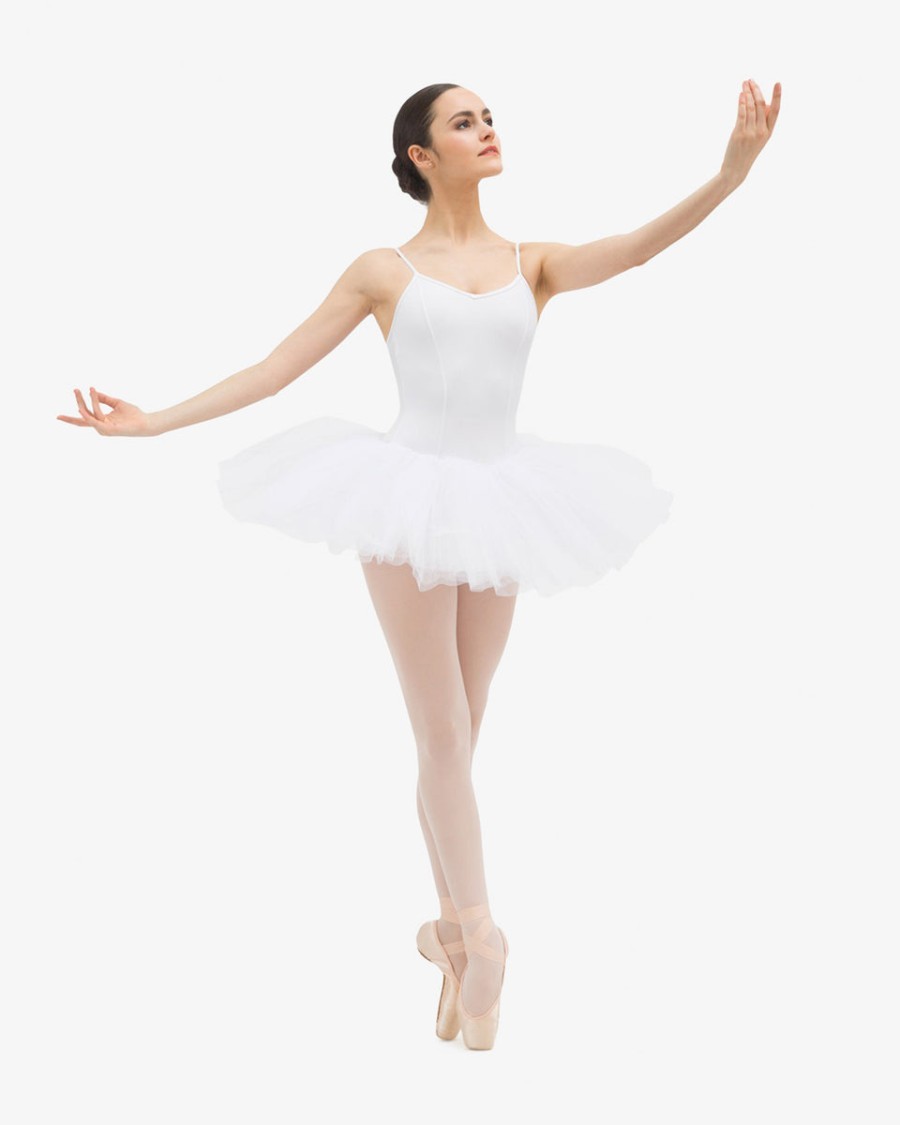 The lady’s plate tutu is made of 6 layers of stiff tulle. The corset style in Lycra® and the princess seams emphasize the dancer’s silhouette. The spaghetti straps and the round neckline clear the upper body. It can also be the basis for more elaborated stage costumes. This model has a front lining. Transparent transfer of the Repetto logo on the back.